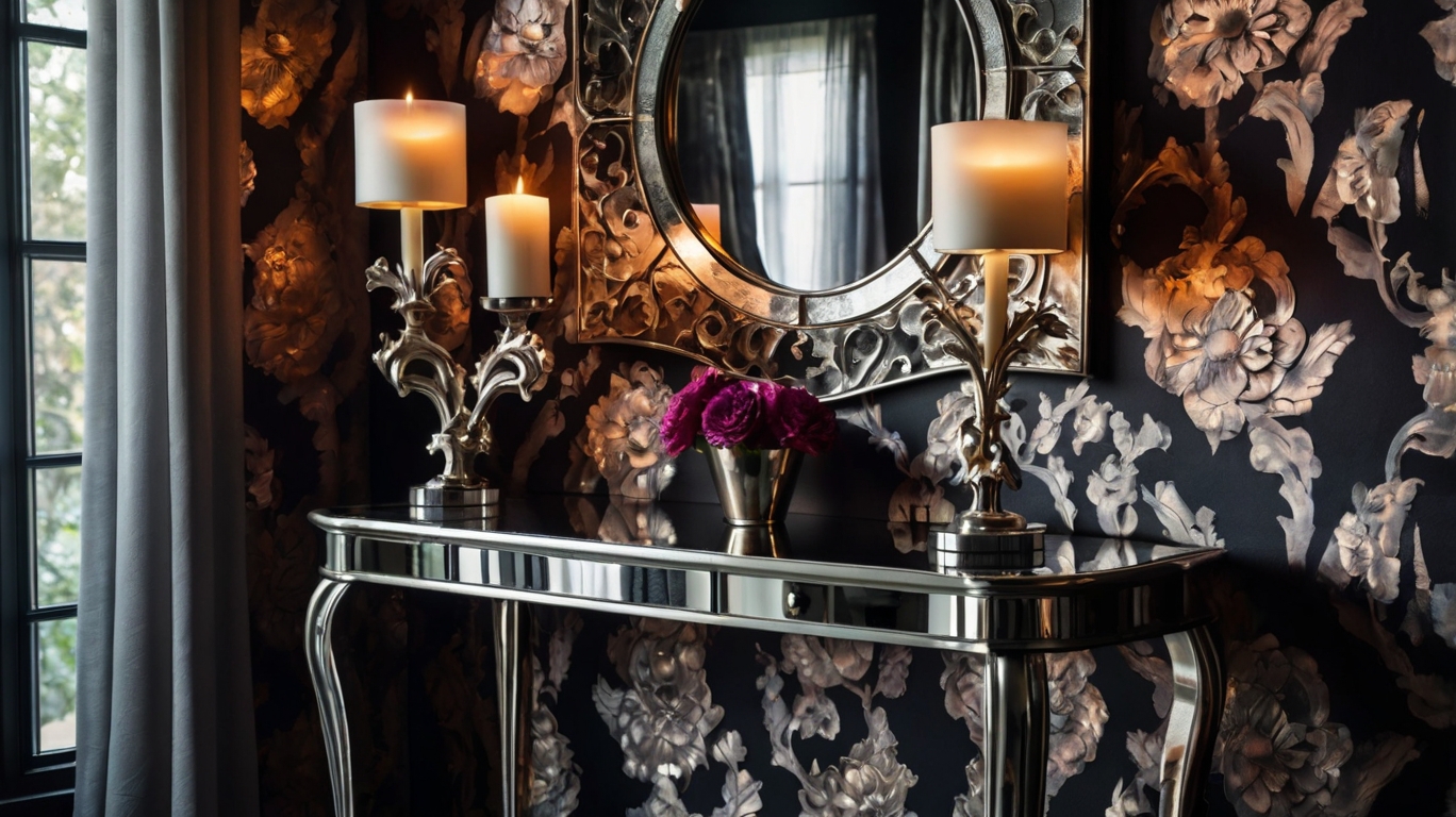 In the entryway, a vintage mirror or artwork with gilded or baroque elements sets the tone from the moment you enter.
